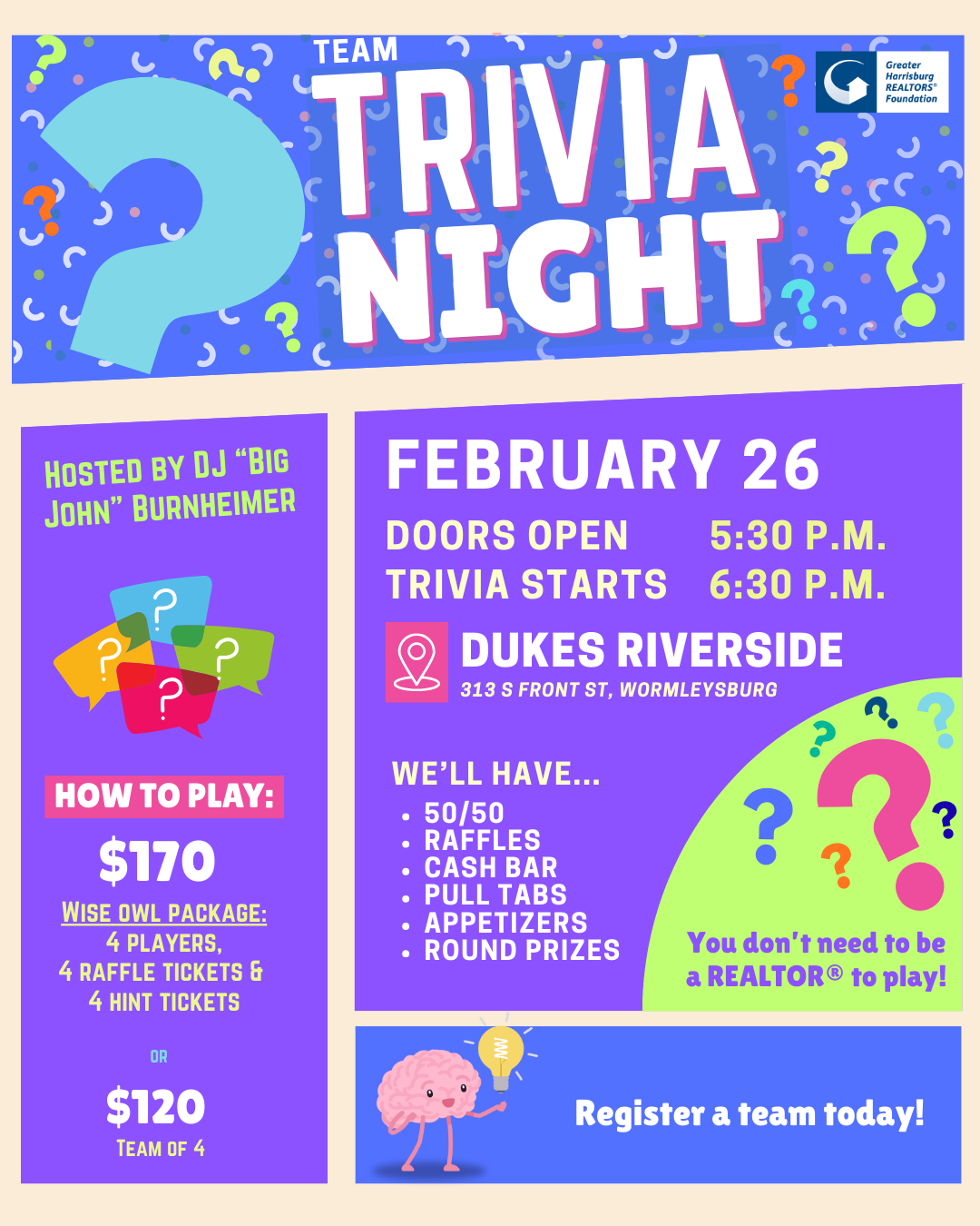 Put Your Knowledge to the Test for a Great Cause! Join us for a fun, team-based trivia night benefiting the GHAR Foundation! Grab your trivia-loving friends, enjoy appetizers and a cash bar, and compete for prizes — all while supporting the Foundation!🚪 Doors Open: 5:30 PM🧩 Trivia Begins: 6:30 PM 🎧 Hosted by DJ Big […] |